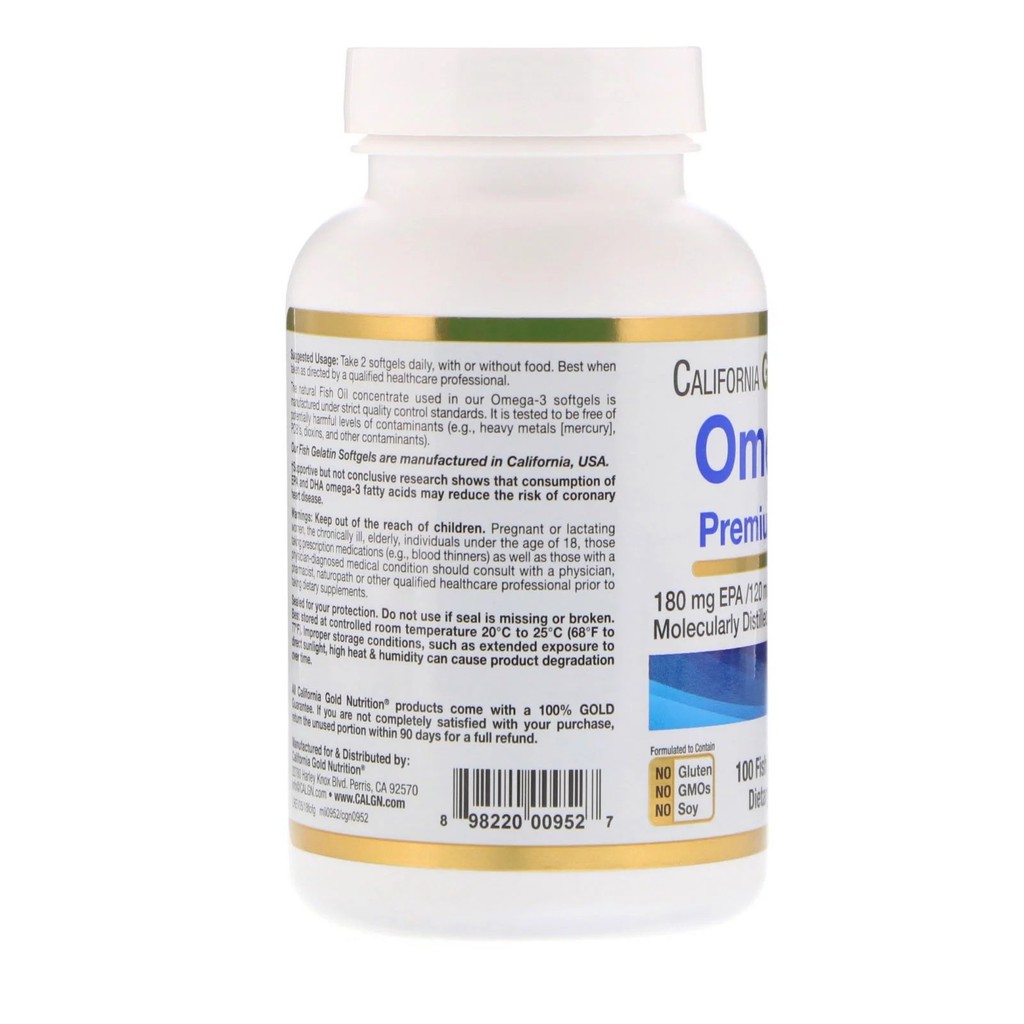 Omega-3 Premium Fish Oil, by California Gold Nutrition®, is a molecularly distilled, supercritical extraction that features 360 mg of EPA and 240 mg of DHA per 2000 mg of natural fish oil concentrate. The fish gelatin softgels are porcine and bovine free and manufactured in California, USA.
